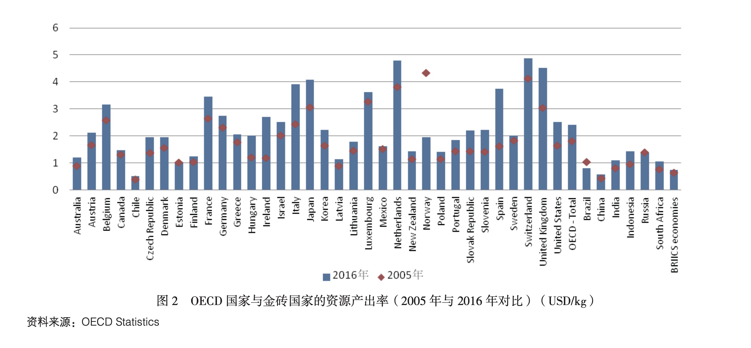 在OECD對資源產(chǎn)出率的研究中,將資源分為生物質(zhì)(食物和飼料、木材)、化石能源、非金屬礦物(建筑材料、其他非金屬礦物)、金屬及金屬礦物四大類。研究結(jié)果顯示,2005至2016年,大部分國家的資源產(chǎn)出率均有所增長;金磚國家的資源產(chǎn)出率與OECD國家相比仍有較大差距(見圖2)。