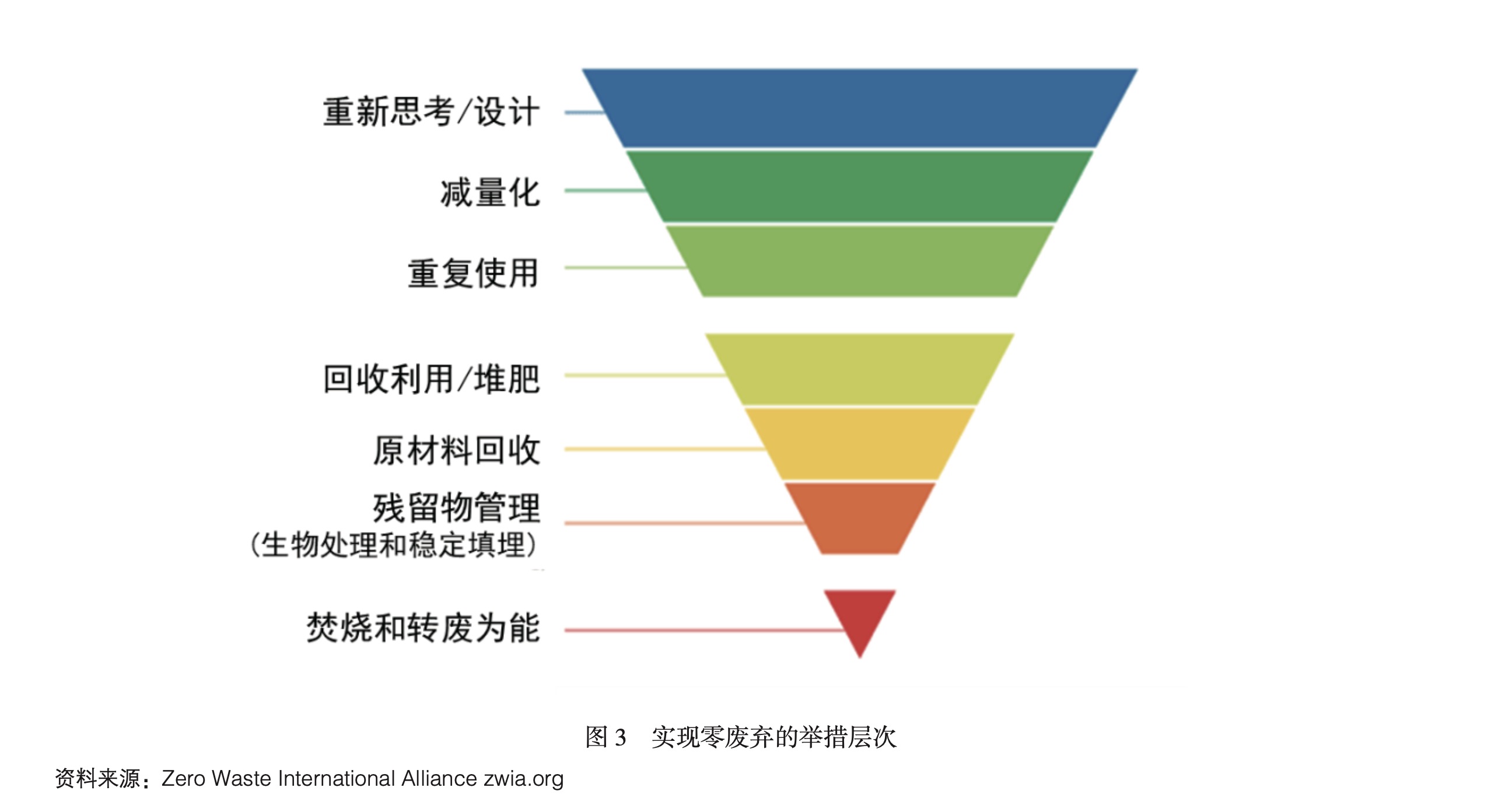 “無廢”的關鍵舉措即減量化(reducing)、再利用(reusing)、再循環(huán)(recycling)(3R原則)及無害化處置的焚燒(energyrecovery)和填埋(disposal)。近年來,“無廢”的定義不斷演進,零廢棄國際聯(lián)盟(ZeroWasteInternationalAlliance)對“無廢”的最新定義為“通過負責任的生產(chǎn)、消費、重復使用以及產(chǎn)品、包裝和材料的回收來保護所有資源,不使用焚燒,且避免任何威脅環(huán)境或人類健康的排放”。相應,3R原則也得到了拓展,且體現(xiàn)出兩大新特點,一是更加重視源頭減量,最推薦的舉措是在產(chǎn)品設計環(huán)節(jié)就考慮減少廢棄物產(chǎn)生;二是為了減少溫室氣體排放,焚燒排在填埋之后成為最不推薦的兜底舉措(見圖3)。