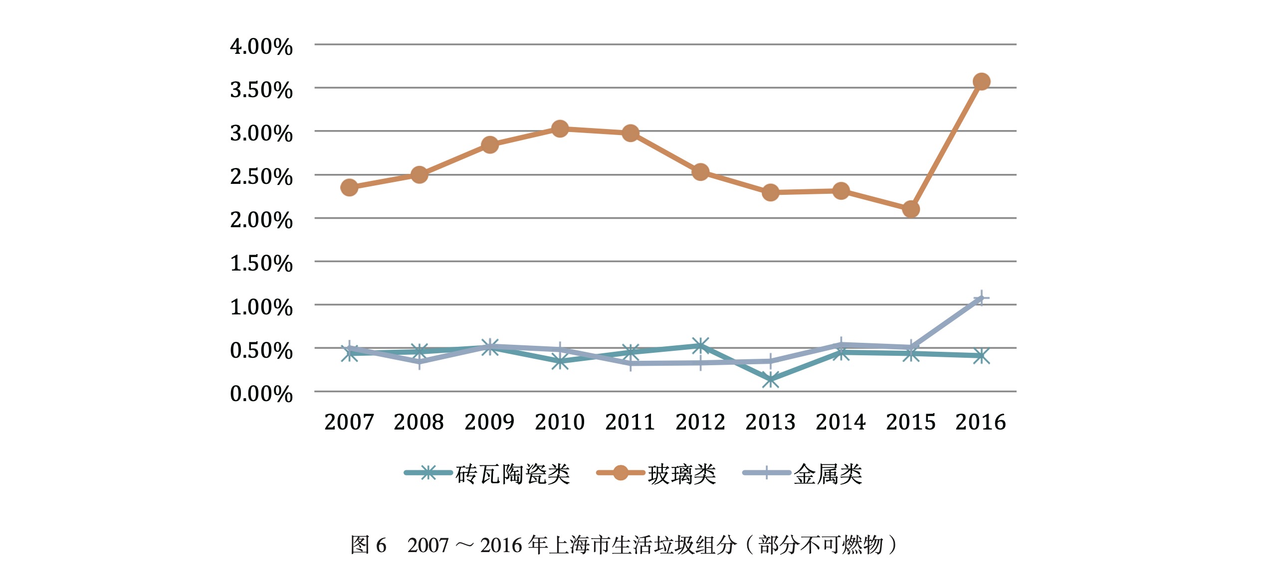 垃圾焚燒爐渣的主要成分包括陶瓷碎片、磚石、石頭、玻璃、熔渣、鐵、其他金屬等不可燃物④。一方面,上海市生活垃圾組分中不可燃部分(見圖6)未見明顯下降,另一方面,需要與生活垃圾協(xié)同焚燒的拆房和裝修垃圾殘渣居高不下,其中包含較多不可燃物質(zhì)。因此,上海亟待通過加強垃圾分類減少垃圾焚燒爐渣,近期《上海市生活垃圾管理條例》的發(fā)布邁出了堅實的一步。