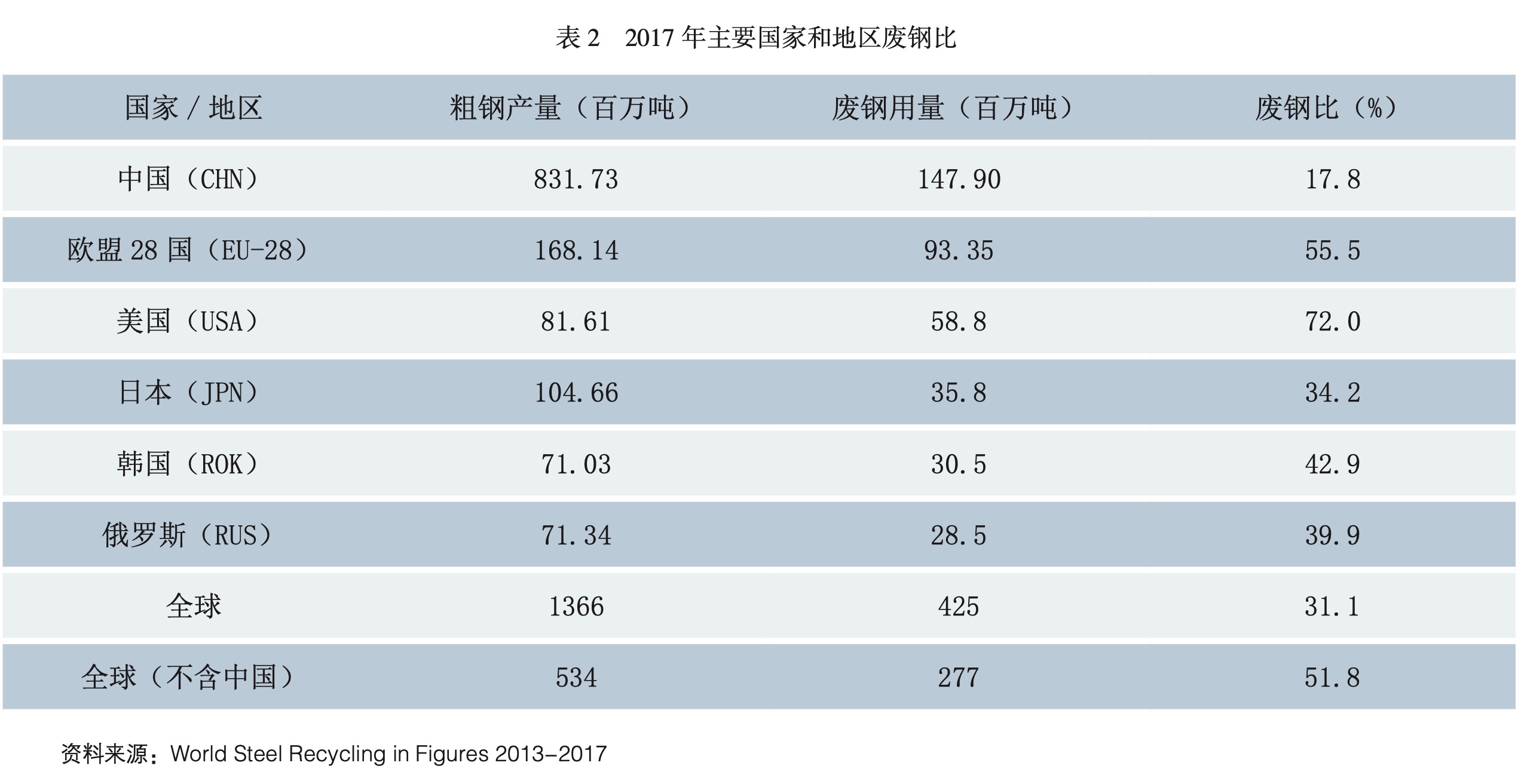 鋼鐵生產(chǎn)工藝主要分成長流程和短流程兩大類,長流程工藝指以煤炭、鐵礦石為原材料,經(jīng)過煉焦、燒結(jié)、高爐煉鐵、轉(zhuǎn)爐煉鋼等工序生產(chǎn)粗鋼的工藝,短流程工藝指以廢鋼鐵為原材料,主要通過電爐煉鋼生產(chǎn)粗鋼的工藝。其中的核心指標即廢鋼比(廢鋼鐵用量與粗鋼產(chǎn)量之比),廢鋼比越高,說明鋼鐵生產(chǎn)工藝越偏向于短流程。我國鋼鐵生產(chǎn)工藝整體偏向于長流程,廢鋼比在世界主要產(chǎn)鋼國中處于最低水平(見表2),因此我國鋼鐵生產(chǎn)能耗強度和污染物排放強度均偏高①。