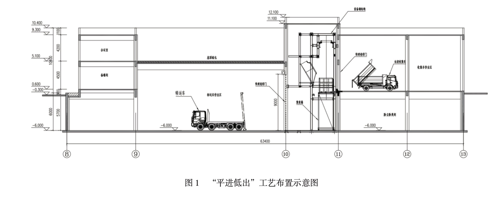 關(guān)于工藝布置方案的選擇,國內(nèi)大中型垃圾轉(zhuǎn)運(yùn)站布置方案主要可分為以下三種:(1)“高進(jìn)平出”工藝布置。收集車爬坡卸料,箱體地上轉(zhuǎn)移,轉(zhuǎn)運(yùn)車出入口與地面平齊。該方案需修筑較長收集車坡道和較高站房,收集車爬坡后在二層卸料,垃圾壓縮裝箱、轉(zhuǎn)運(yùn)在一層大廳完成。(2)“平進(jìn)低出”工藝布置。收集車地面卸料,垃圾壓縮裝箱、轉(zhuǎn)運(yùn)車牽箱在地下一層完成,修筑地面至地下一層坡道,供轉(zhuǎn)運(yùn)車出入。(3)“平進(jìn)平出”工藝布置。收集車地面卸料、箱體地下提升方案,該方案不需修筑收集卸料坡道,收集車在一層卸料,垃圾壓縮裝箱在地下一層完成,箱體通過翻轉(zhuǎn)提升,完成與轉(zhuǎn)運(yùn)車對(duì)接。