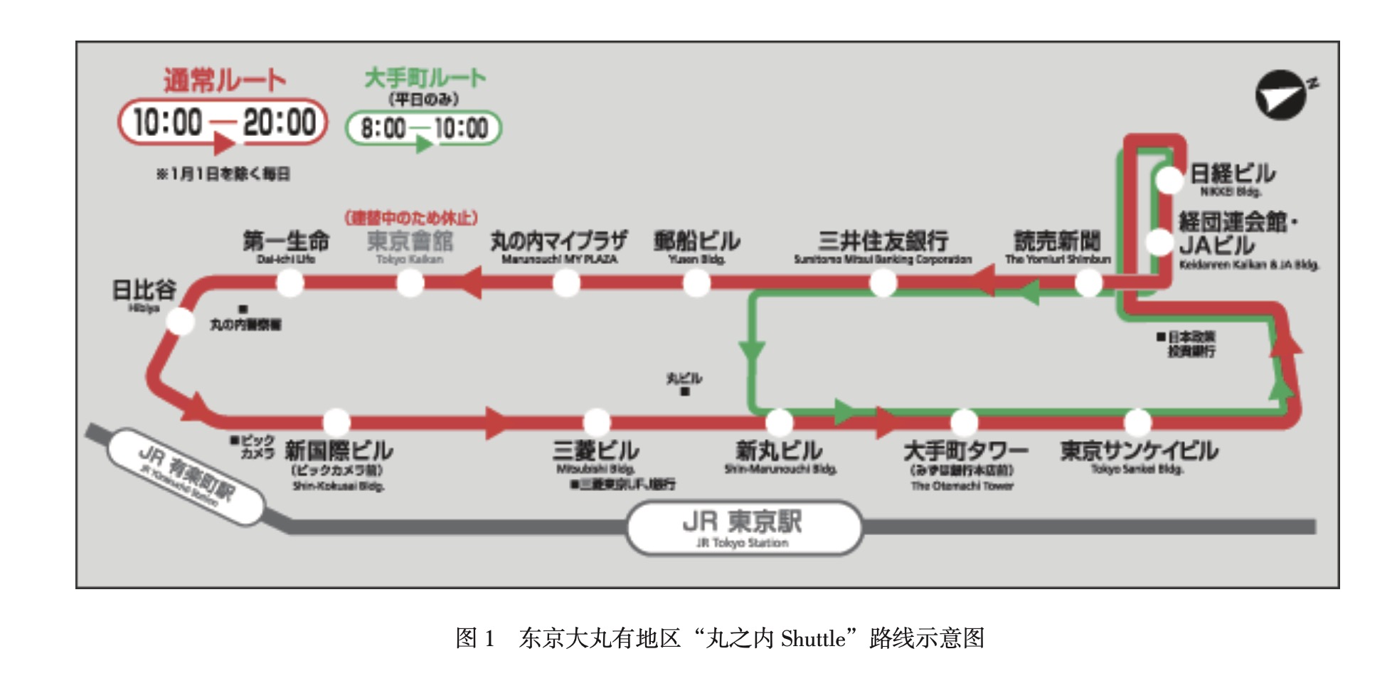 大丸有區(qū)域內(nèi)還設(shè)有一條免費(fèi)的接駁巴士“丸之內(nèi)Shuttle”,連接大手町、丸之內(nèi)和有樂町內(nèi)的主要辦公樓和商場,發(fā)車間隔時間為12~15分鐘。其中紅線為常規(guī)線路,在工作日的8:00~20:00、周末和節(jié)假日的10:00~20:00運(yùn)行;綠線為大手町專線,只在工作日的8:00~10:00運(yùn)行,能夠在一定程度上緩解區(qū)域早高峰的壓力(見圖1)。丸之內(nèi)Shuttle由區(qū)域內(nèi)企業(yè)共同贊助,采用低污染、低噪音的混合動力客車,并開發(fā)了手機(jī)客戶端供乘客查詢接駁巴士的運(yùn)行時間表和各站點周邊的設(shè)施,每年約有67萬人乘坐該接駁巴士。