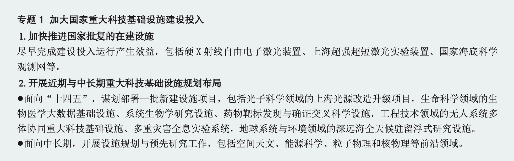 一是基礎(chǔ)層,優(yōu)化重大科技基礎(chǔ)設(shè)施建設(shè)布局,支撐重大科技突破。面向在建設(shè)施,加快推進(jìn)盡早投入運(yùn)行發(fā)揮效益;面向“十四五”,部署一批生命、光子、工程領(lǐng)域新建設(shè)施項(xiàng)目;面向中長(zhǎng)期,開展空天、能源、粒子物理領(lǐng)域規(guī)劃與預(yù)先研究。