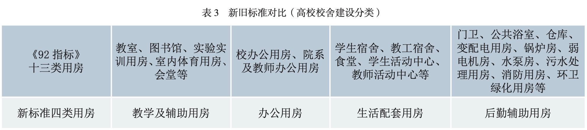 按大類指標(biāo)控制高校不同功能用房的出發(fā)點是賦予高校更多自主權(quán)和特色化發(fā)展的空間。在總量控制的前提下,新標(biāo)準(zhǔn)將《92指標(biāo)》的13個分項指標(biāo)歸并為教學(xué)及輔助用房、辦公用房、生活配套用房、后勤輔助用房四個大類進行控制,內(nèi)部不再做具體劃分和要求,同時對大類具體包含的功能用房內(nèi)容也根據(jù)實際情況做了優(yōu)化調(diào)整。由于高等教育發(fā)展的日新月異,新興學(xué)科、交叉學(xué)科不斷出現(xiàn),賦予高校在用房調(diào)配方面的合理自主權(quán),能夠有力支持高校在這方面的靈活性和適應(yīng)性。