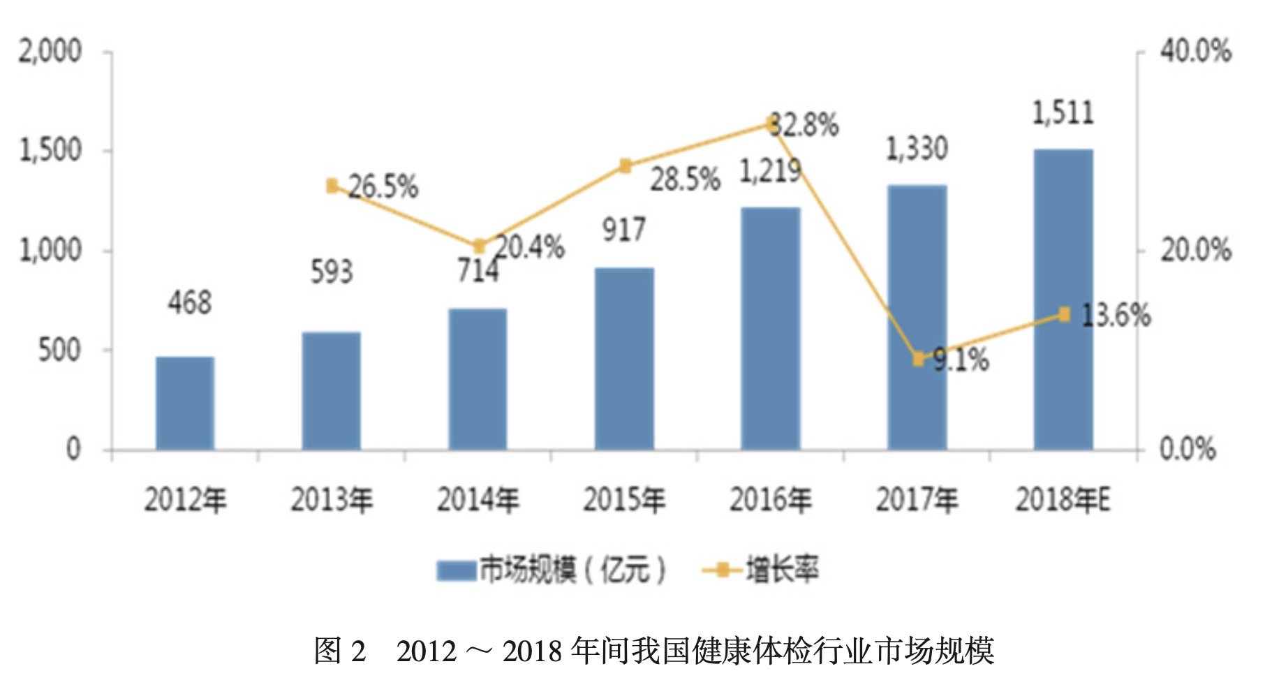 2012~2017年間,我國(guó)體檢市場(chǎng)規(guī)模的復(fù)合增長(zhǎng)率超過(guò)了23.2%,在2018年我國(guó)體檢市場(chǎng)規(guī)模已經(jīng)高達(dá)1511億,詳見圖2。