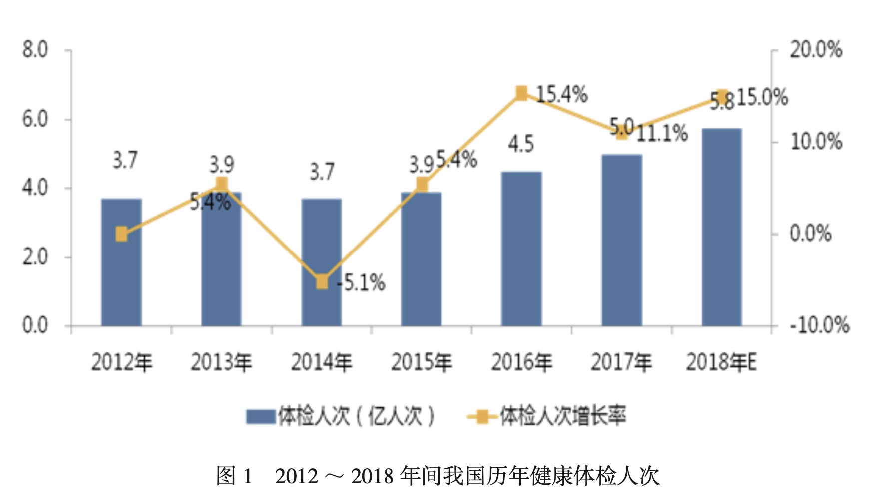 從全國(guó)市場(chǎng)來(lái)看,近年來(lái)我國(guó)健康體檢行業(yè)的發(fā)展呈快速增長(zhǎng)態(tài)勢(shì)。根據(jù)國(guó)家衛(wèi)生健康委員會(huì)相關(guān)統(tǒng)計(jì)數(shù)據(jù)及艾媒咨詢發(fā)布的《2018-2019中國(guó)體檢行業(yè)研究與商業(yè)投資決策分析報(bào)告》,2012~2017年間,我國(guó)體檢人次的復(fù)合增長(zhǎng)率約為6.2%,在2018年我國(guó)體檢人次已經(jīng)達(dá)到了5.8億,詳見圖1。