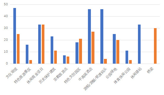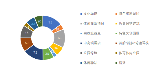 文旅資源豐富多元。從類型來看,文商旅資源占比高。兩岸中高端酒店和文化場館(含博物館、劇場、藝術館、展覽館、紀念館等)和資源最豐富,單類數量分別為73、72項,兩類合計占比近三分之一。休閑商業(yè)項目次之,資源數量66項。從要素來看,食住行游購娛、商養(yǎng)學閑情奇全覆蓋。兩岸文化和旅游資源多樣,商務、養(yǎng)生、研學、休閑、情感、探索等新產品新要素能夠滿足新時代游客的多元需求。