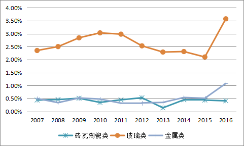 圖6 2007~2016年上海市生活垃圾組分(部分不可燃物)