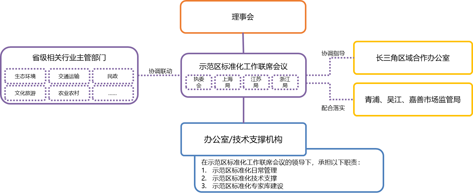 建立聯(lián)席會議制度。建議由示范區(qū)執(zhí)委會牽頭,聯(lián)合上海、江蘇、浙江市場監(jiān)管局建立示范區(qū)標(biāo)準(zhǔn)化聯(lián)席會議制度,示范區(qū)執(zhí)委會擔(dān)任總召集人,上海、江蘇、浙江市場監(jiān)管局擔(dān)任輪值召集人,每半年定期召開一次會議,長三角區(qū)域合作辦公室和上海、江蘇、浙江相關(guān)行業(yè)主管部門,青浦區(qū)、吳江區(qū)、嘉善縣市場監(jiān)管局為成員單位(詳見圖2)。