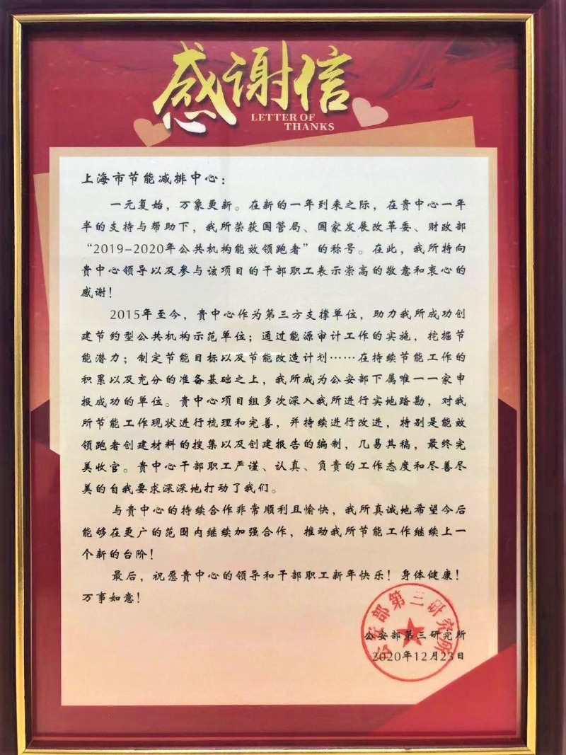中心自2019年8月受公安部第三研究所委托開展公共機構能效領跑者創(chuàng)建咨詢服務,一年來中心秉持上咨“最優(yōu)方案策源者、咨詢服務集成者、獨立智慧發(fā)聲者”的服務理念,為公安部第三研究所開展了一系列創(chuàng)建方案策劃、實施路徑研究和工作機制建設等工作,通過完善節(jié)能制度、建全能源體系、挖掘降耗潛力、推進節(jié)能技改等階段性工作的持續(xù)推進,實現了管理節(jié)能與技術節(jié)能的雙“領跑”。整個創(chuàng)建過程中歷經國管局、公安部、工信部、教育部等部委多輪現場考察和專家評審,最終成功助力公安部第三研究所脫穎而出,成為全國公安系統(tǒng)唯一榮獲“國管局、國家發(fā)展改革委、財政部2019-2020年公共機構能效領跑者”榮譽稱號的機構,工作成果得到公安部領導高度重視和肯定,并作為先進典型在全系統(tǒng)推廣。