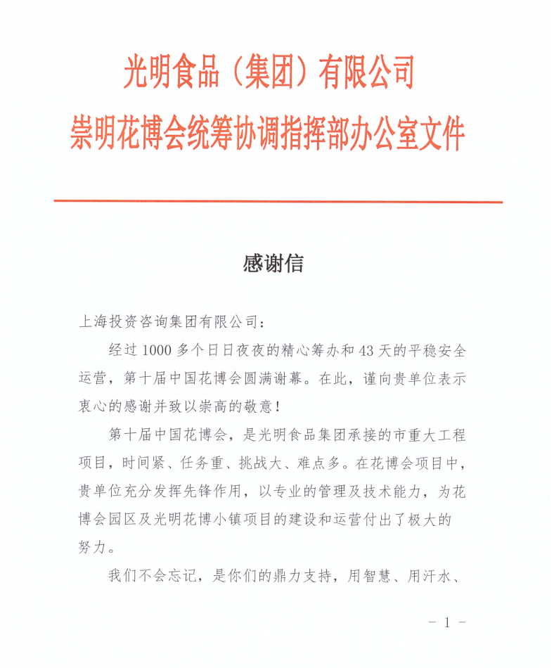 近日,光明食品(集團)有限公司崇明花博會統(tǒng)籌協(xié)調(diào)指揮部特此發(fā)來感謝信,感謝上咨集團所做的相關工作和付出的辛勤勞動,指出“在花博會項目中,貴單位充分發(fā)揮先鋒作用,以專業(yè)的管理和技術能力,為花博會園區(qū)及光明花博小鎮(zhèn)項目的建設和運營付出了極大的努力”。