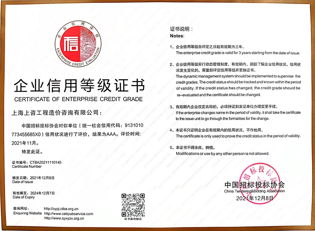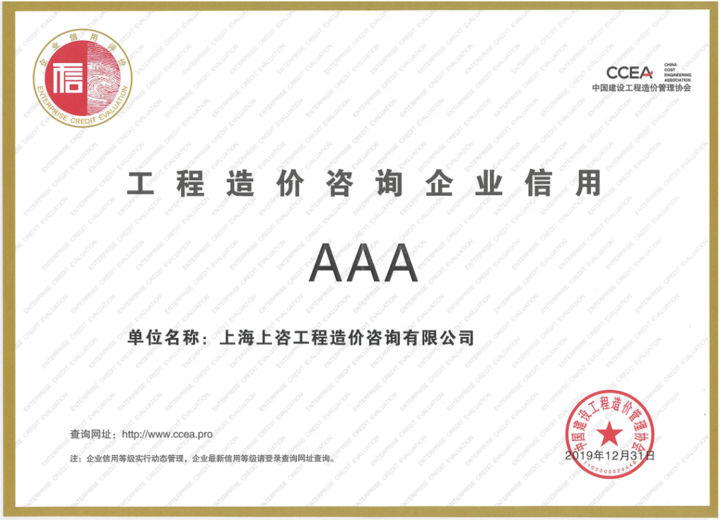 這是上咨造價(jià)繼獲評(píng)“中國建設(shè)工程造價(jià)管理協(xié)會(huì)工程造價(jià)咨詢企業(yè)信用AAA級(jí)”后的又一項(xiàng)國家級(jí)企業(yè)信用最高等級(jí)榮譽(yù)。企業(yè)信用最高等級(jí)的獲得,是行業(yè)對(duì)上咨造價(jià)專業(yè)能力和服務(wù)水平的充分肯定。