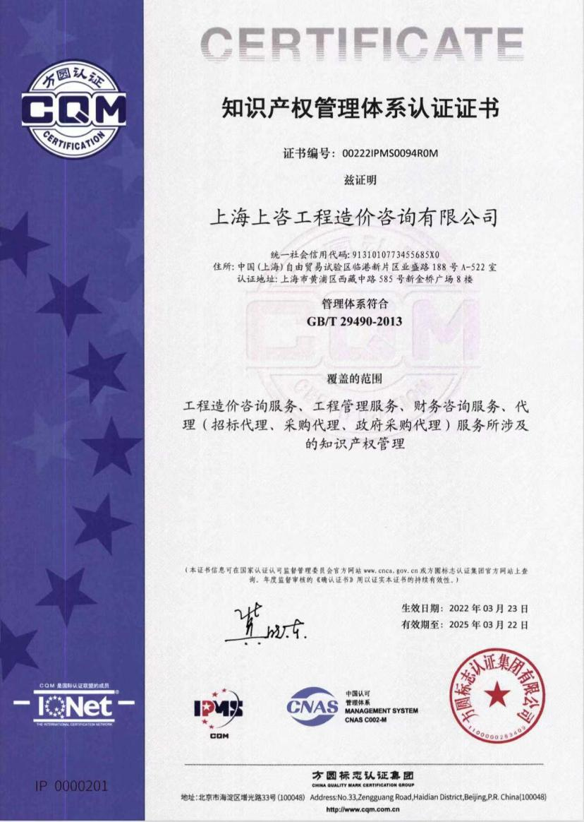 上咨造價(jià)榮獲知識(shí)產(chǎn)權(quán)管理體系認(rèn)證證書(shū)