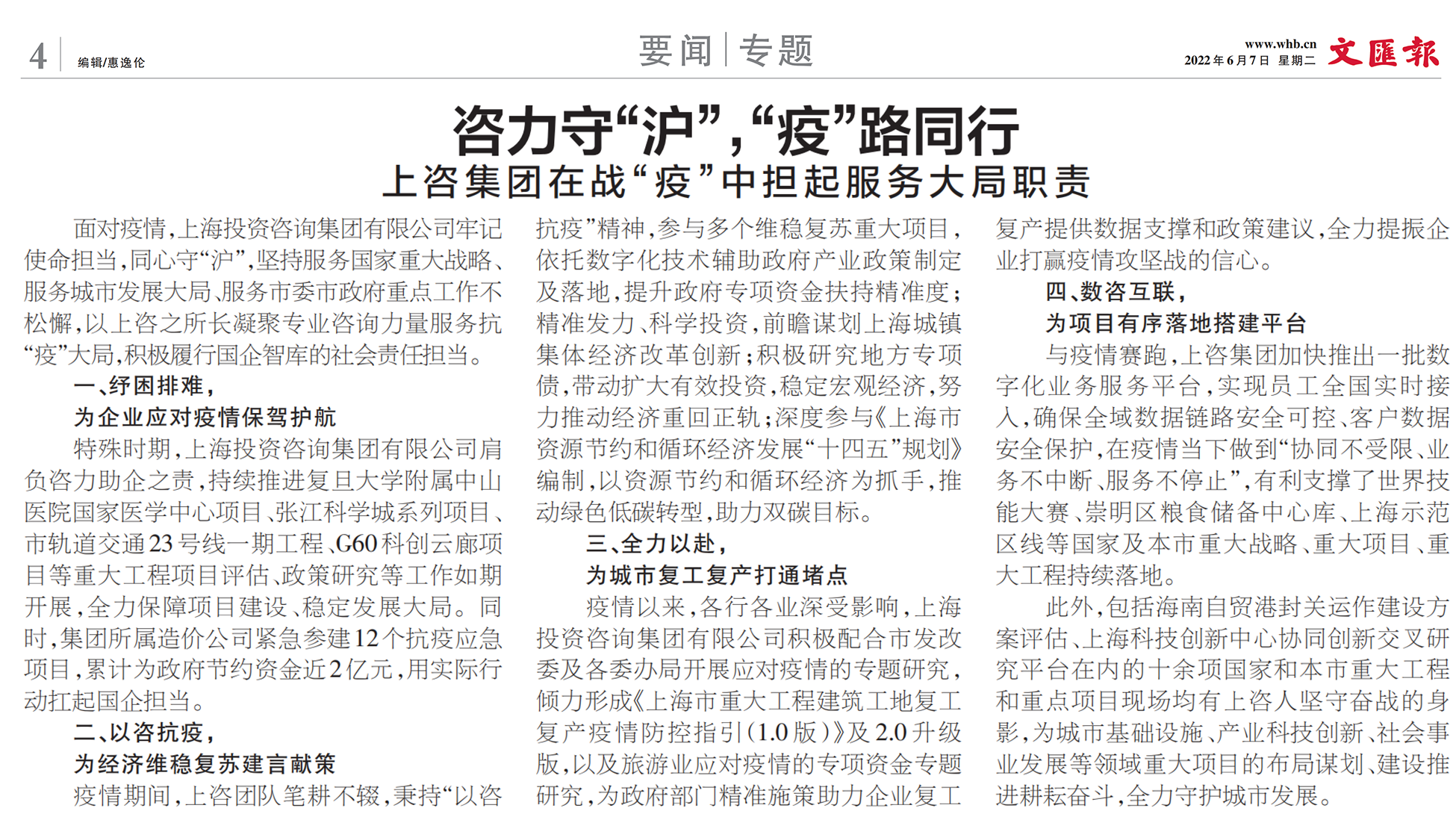 2022年6月7日,文匯報刊登《咨力守“滬”,“疫”路同行——上咨集團在戰(zhàn)“疫”中擔(dān)起服務(wù)大局職責(zé)》一文,專題報道上咨集團以咨詢力量服務(wù)抗“疫”大局,積極履行國企智庫的社會責(zé)任擔(dān)當,以下為報道原文: