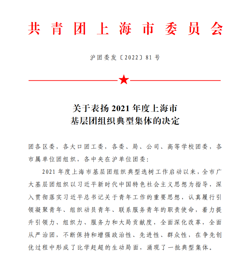 2022年是中國(guó)共青團(tuán)成立100周年。近日,共青團(tuán)上海市委員會(huì)作出表彰決定,授予156個(gè)團(tuán)(總)支部“上海市基層團(tuán)組織典型選樹(shù)”稱(chēng)號(hào)。