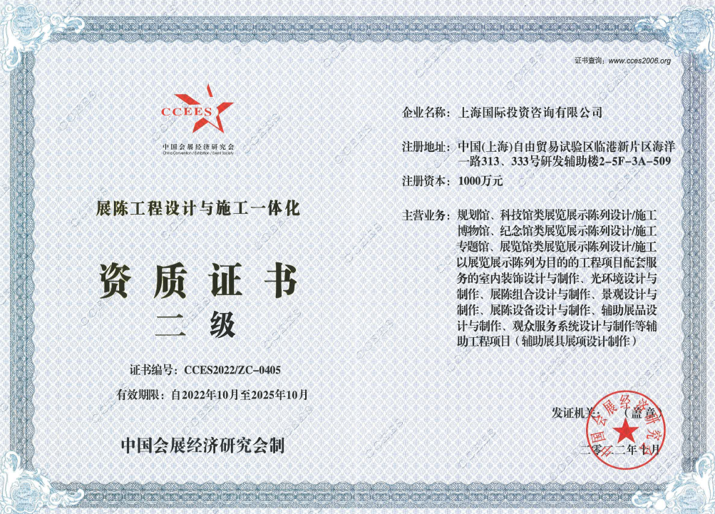2022年11月,上咨國(guó)際成功取得中國(guó)會(huì)展經(jīng)濟(jì)研究會(huì)頒發(fā)的《展陳工程設(shè)計(jì)與施工一體化資質(zhì)(二級(jí))證書》,標(biāo)志著公司從展陳策劃咨詢到布展工程實(shí)施的全過程服務(wù)鏈構(gòu)建完成。