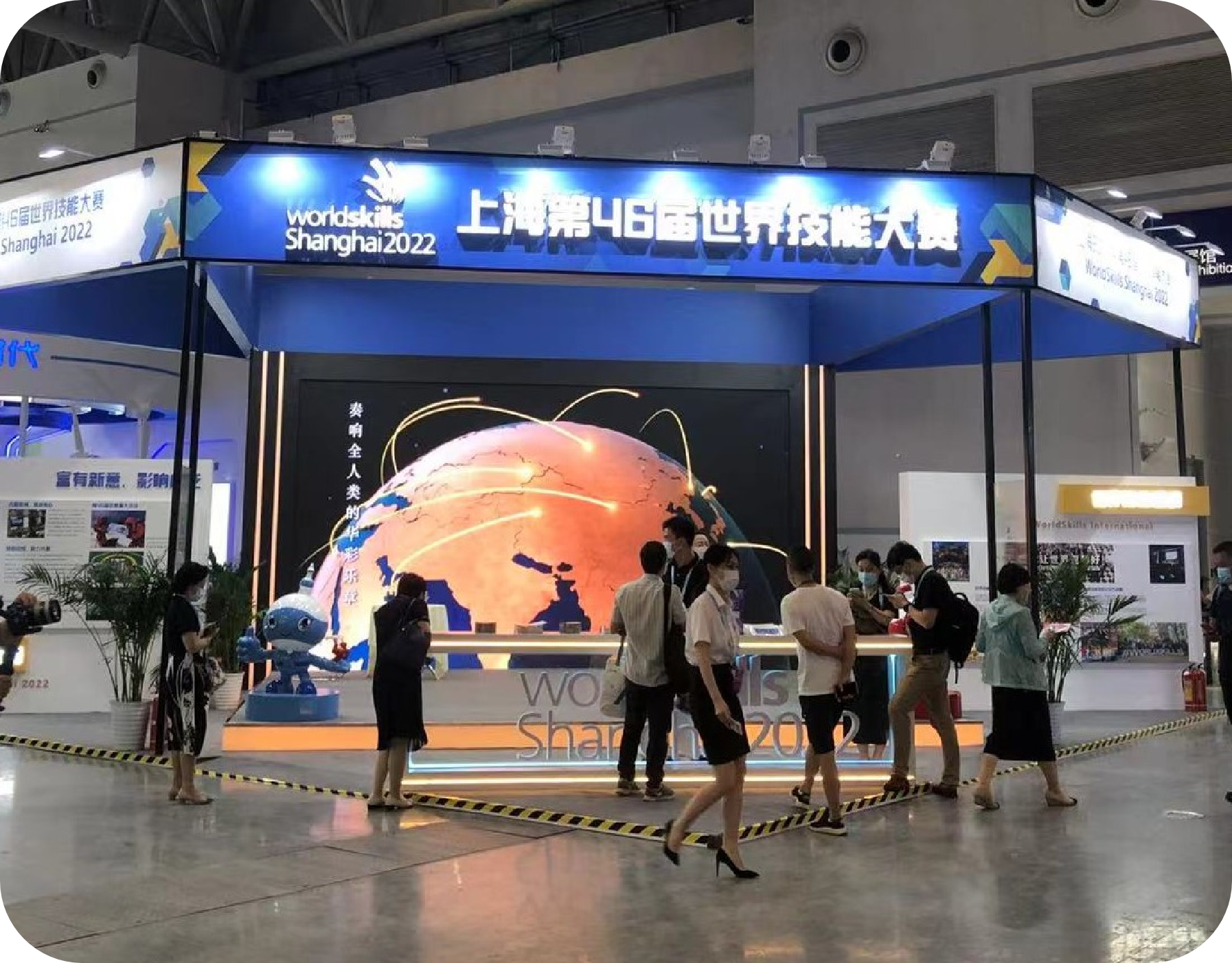2020-2021年,上咨承接了世界技能大賽的宣傳工作,在籌備期間將世賽宣傳展臺(tái)帶向了全國(guó)各地,不僅去到了重慶、廣州、新疆等地參加了全國(guó)性比賽及會(huì)議,更是入駐了進(jìn)博會(huì),收到了參觀領(lǐng)導(dǎo)的高度認(rèn)可。