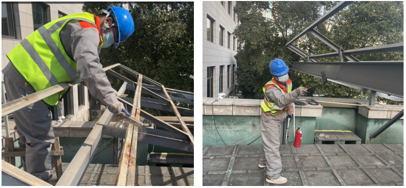 本項(xiàng)目對(duì)原有支架進(jìn)行除銹和表面打磨,并刷涂多層防銹漆,充分利用原有支架基礎(chǔ)以建設(shè)新光伏發(fā)電系統(tǒng)。施工過(guò)程中,拆除的組件、逆變器、線纜,均由專業(yè)公司進(jìn)行回收利用。