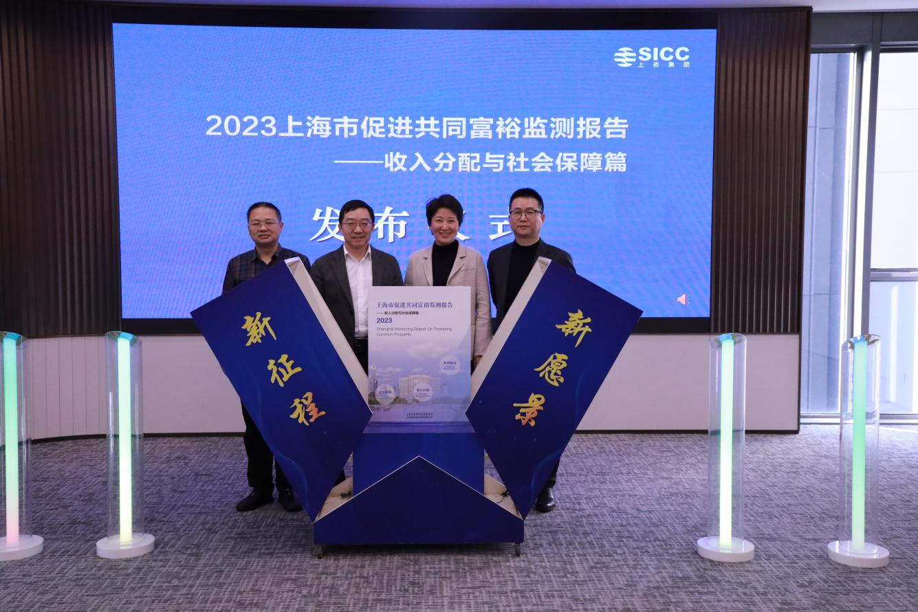 受市發(fā)展改革委收入分配和社會保障處委托,上咨智庫連續(xù)兩年承擔(dān)收入分配和社會保障年度監(jiān)測報(bào)告編撰工作。報(bào)告以《2023上海市促進(jìn)共同富裕監(jiān)測報(bào)告——收入分配和社會保障篇》為題,首次將“共同富裕”寫進(jìn)篇名。報(bào)告從城鄉(xiāng)居民收入、就業(yè)人員工資、居民財(cái)產(chǎn)、社會保障、區(qū)域工作實(shí)踐等方面,全面系統(tǒng)分析了上海收入與分配演變趨勢。市發(fā)展改革委收入分配和社會保障處處長劉軍、三級調(diào)研員賀滿林和上咨集團(tuán)副總工程師呂海燕、智庫研究中心主任周明共同開啟了報(bào)告發(fā)布儀式。